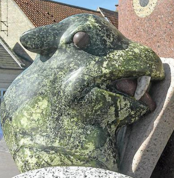 Kunstneren ville ikke lade statuen stå alene. Derfor er der hægtet en basilisk i forskelligt farvet granit bag på statuen.