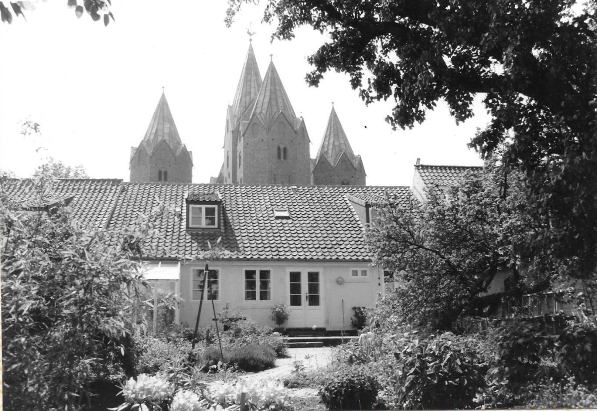 Overfor Adelgade 18, med bagsiden ind mod Vor Frue Kirke, stod tidligere den gamle husflidsskole, denne bygning blev nedrevet i 1962.