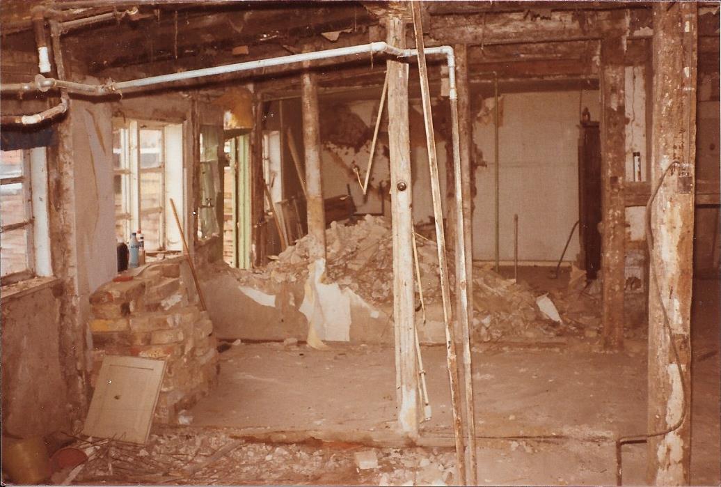 Alle skillevægge blev bygget op igen med brædder, rør og puds.