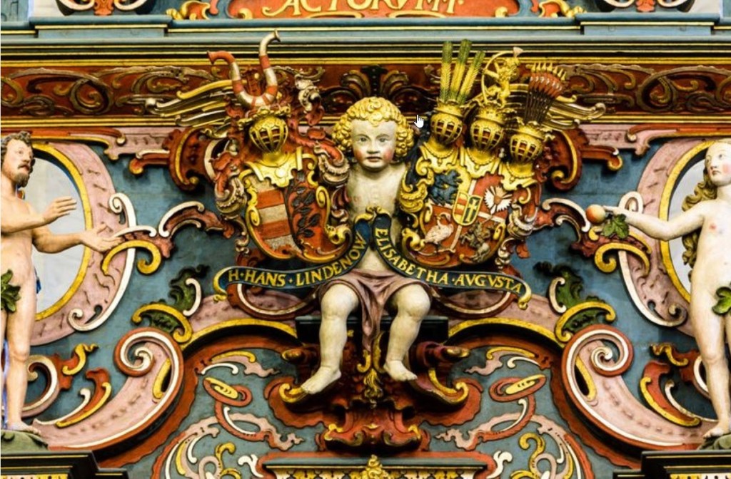 Altertavlen er udført af Lorentz Jørgensen i 1650 i bruskbarok på bestilling af slottets lensmand Hans Lindenow og hans hustru Elisabeth Augusta (datter af Christian IV og Kirstine Munk) hvis våbenskjolde ses lige over nadverscenen båret af en engel (en putto). Altertavlen var oprindelig ubemalet, men i 1701 blev den “stafferet”; farverne blev restaureret i 1971-72.